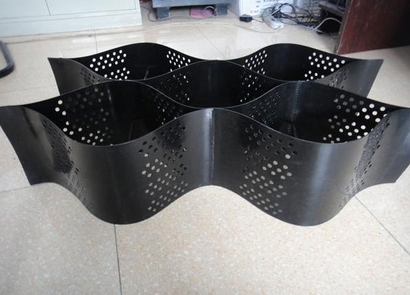 增強土工格室是在塑料片材中加入鋼絲、玻璃纖維、碳纖維等筋材組成的復合片材,通過插件或扣件等連接而成,展開后是蜂窩狀的立體網格。格室未展開時,在同一條片材的同一側,相鄰兩連接處之間的距離為連接距離。